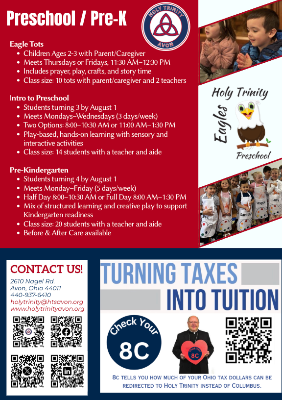 The Eagle Tots program at Holy Trinity School is a Mommy (Daddy or Caregiver) and Me style class designed for children ages 2 to 3. Families can choose to attend either a Thursday or Friday session, from 11:30 am to 12:30 pm. The class is held in our Preschool Building and includes prayer, play, crafts, snack and story time. New sessions will begin March 26th and are limited to 10 students per session. The cost is $30 for a 6-week session and students receive an Eagle Tots t-shirt. Click on the link below to email cheryl.roche@htsavon.org or call 440-937-6420 to hold your spot for the next session.