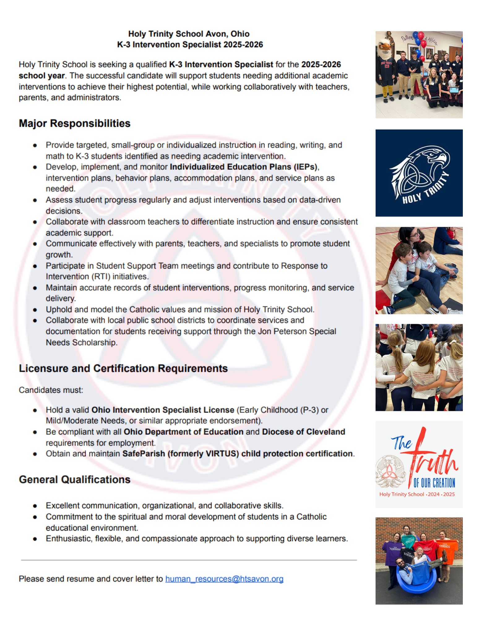 Holy Trinity School is committed to finding highly-qualified, exceptional faculty and staff members dedicated to service and academic excellence.