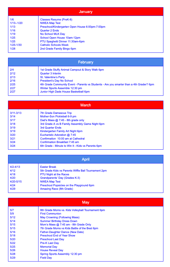 This calendar includes important dates and events to help you plan for the year ahead. Please note that the calendar will be updated regularly as new events are added, so we encourage you to check back often to stay informed about the latest happenings at Holy Trinity. We look forward to a fantastic school year filled with learning, growth, and community engagement.