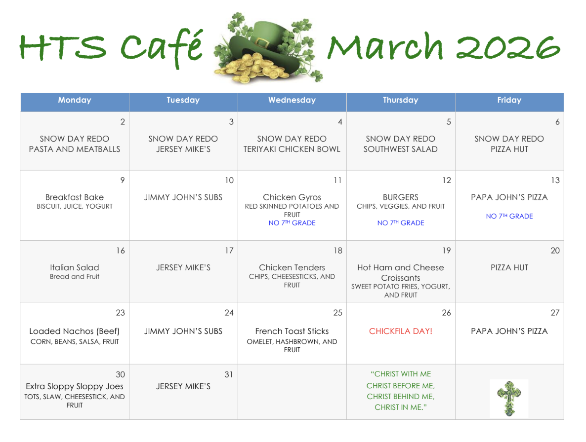 Please note: Our system can not be re-opened after the deadline. Accounts are not credited after orders are placed so be sure to check dates for field trips and doctors appointments before ordering.